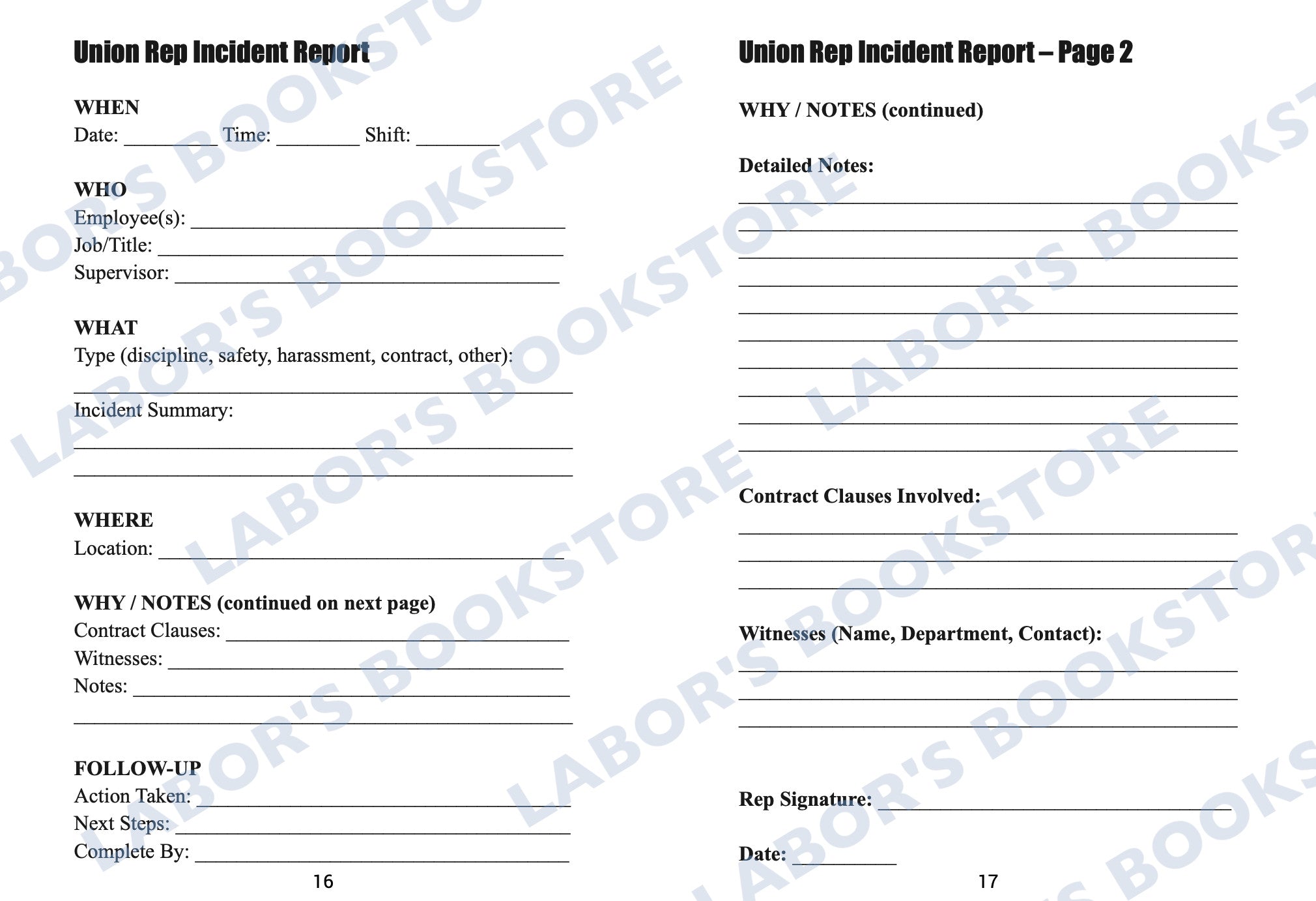 Inside, you’ll find structured incident report pages with guided two-page forms to help you document important information such as dates, times, locations, people involved, workplace discipline, safety concerns, harassment issues, contract violations, witnesses, Weingarten rights, and follow-up deadlines.
